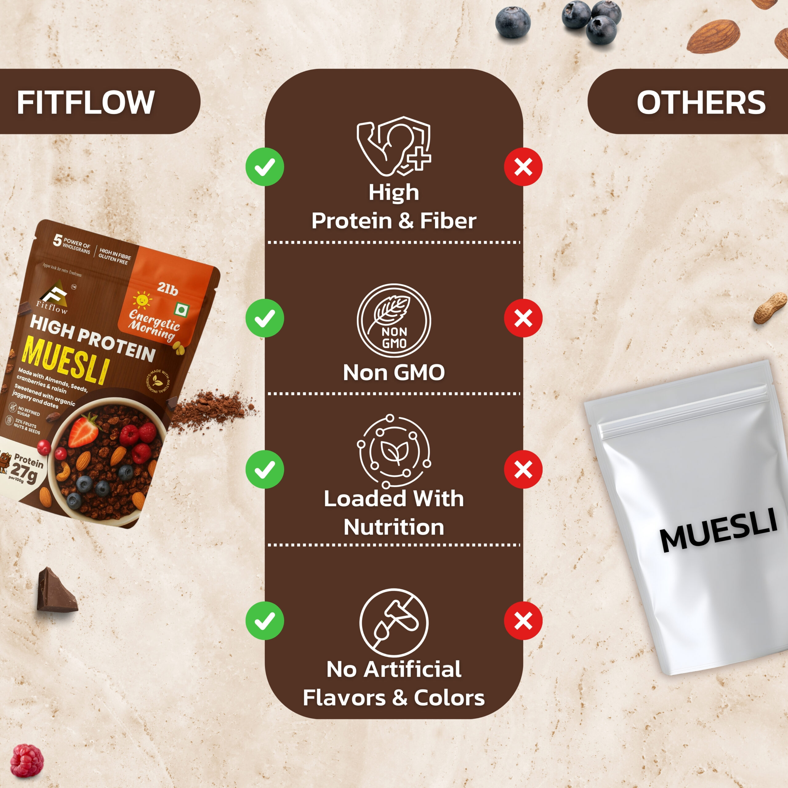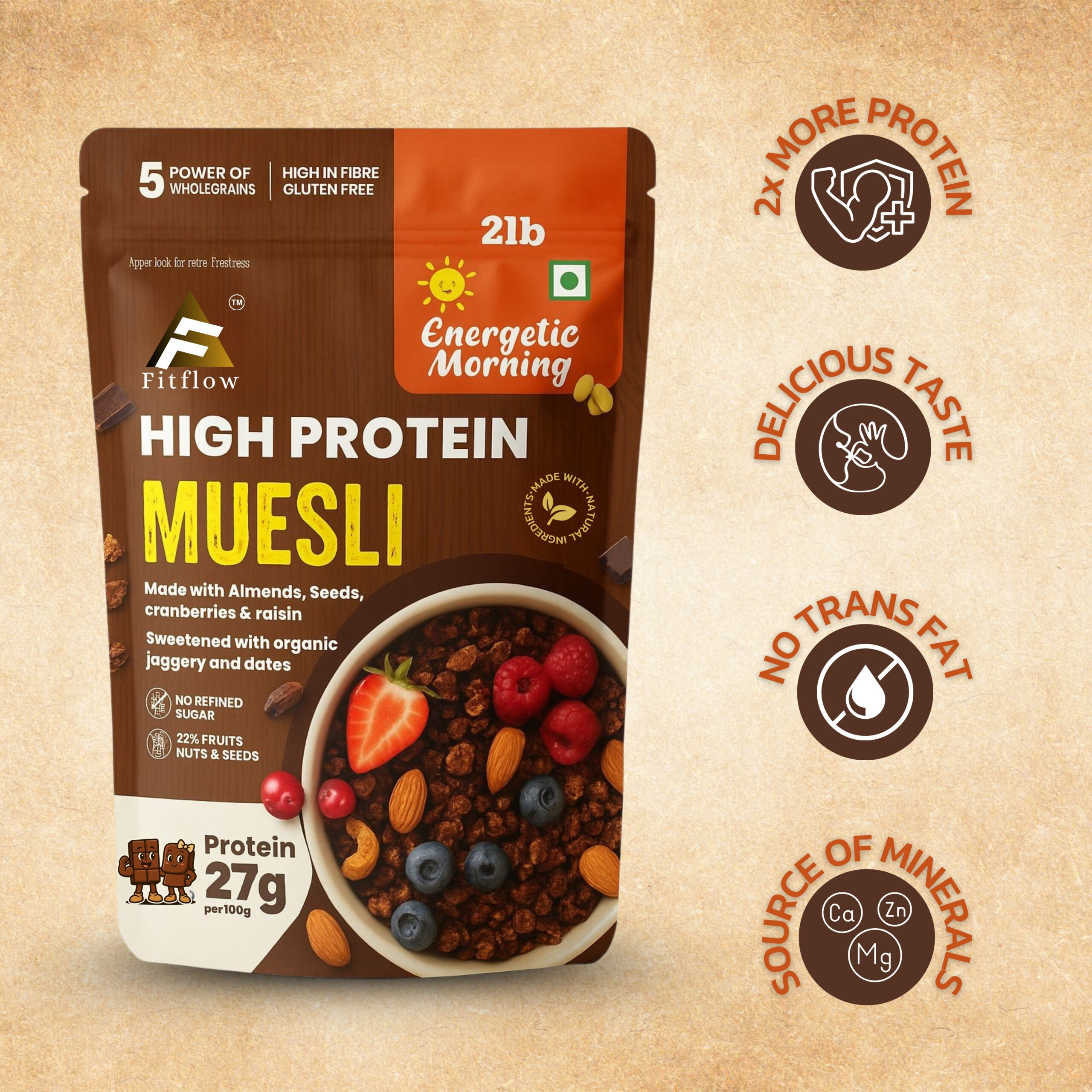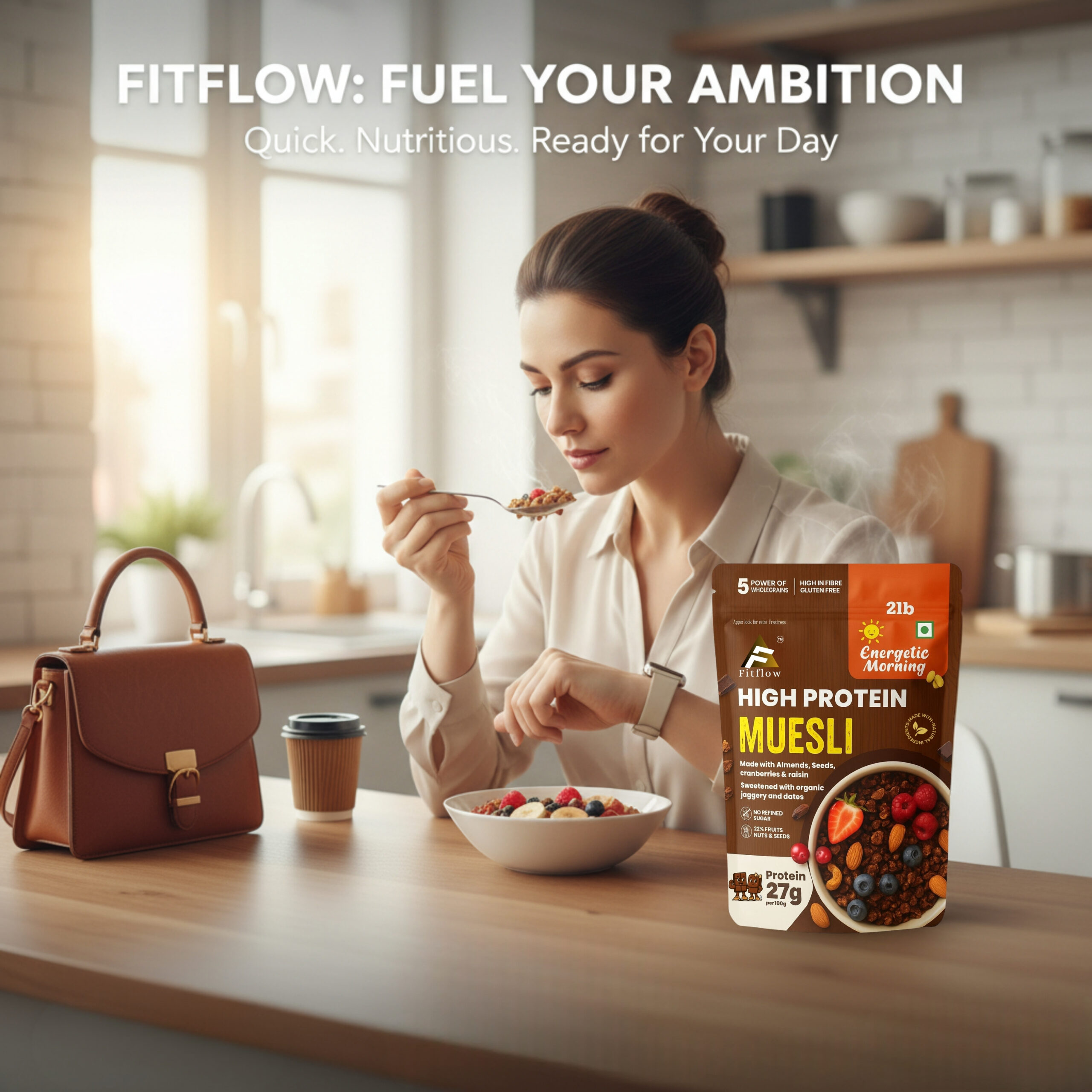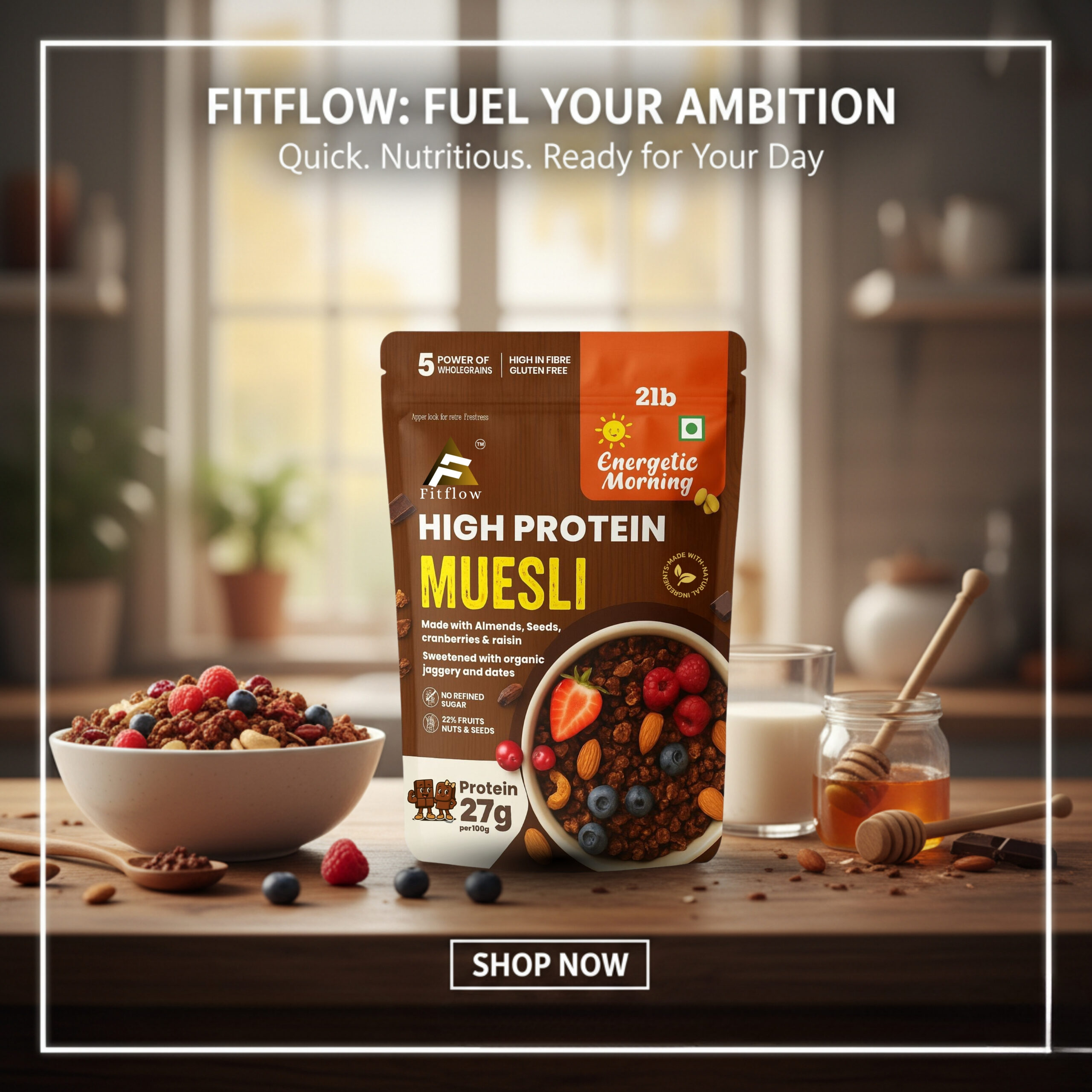 Enjoy it in multiple ways – with milk for a classic bowl, with yogurt for a creamy delight, or even as a crunchy snack straight from the pack. Whether you need a pre-workout fuel, post-workout recovery meal, or an anytime healthy snack, Fitflow High Protein Muesli is your trusted partner for an energetic lifestyle.
