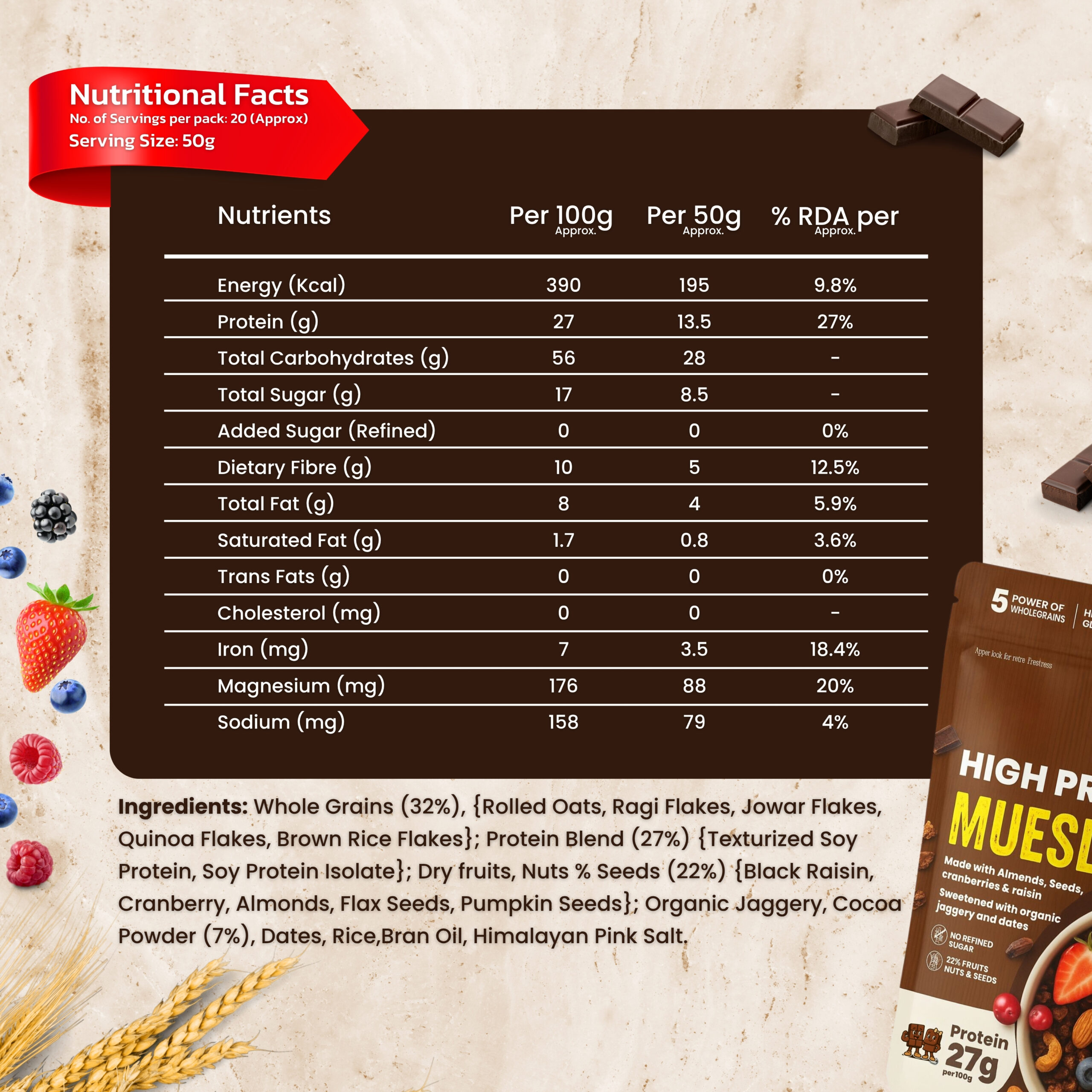 Give your mornings a crunchy, protein-rich, and wholesome start with Fitflow High Protein Muesli. Packed with 27g protein per 100g, this nutrient-dense blend is made using the power of 5 whole grains, premium almonds, seeds, cranberries, and raisins, offering a delicious mix of taste and health.